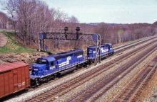 Conrail SD40-2 6365 is seen shoving on the rear of a westbound freight at Cresson, PA in 1993.