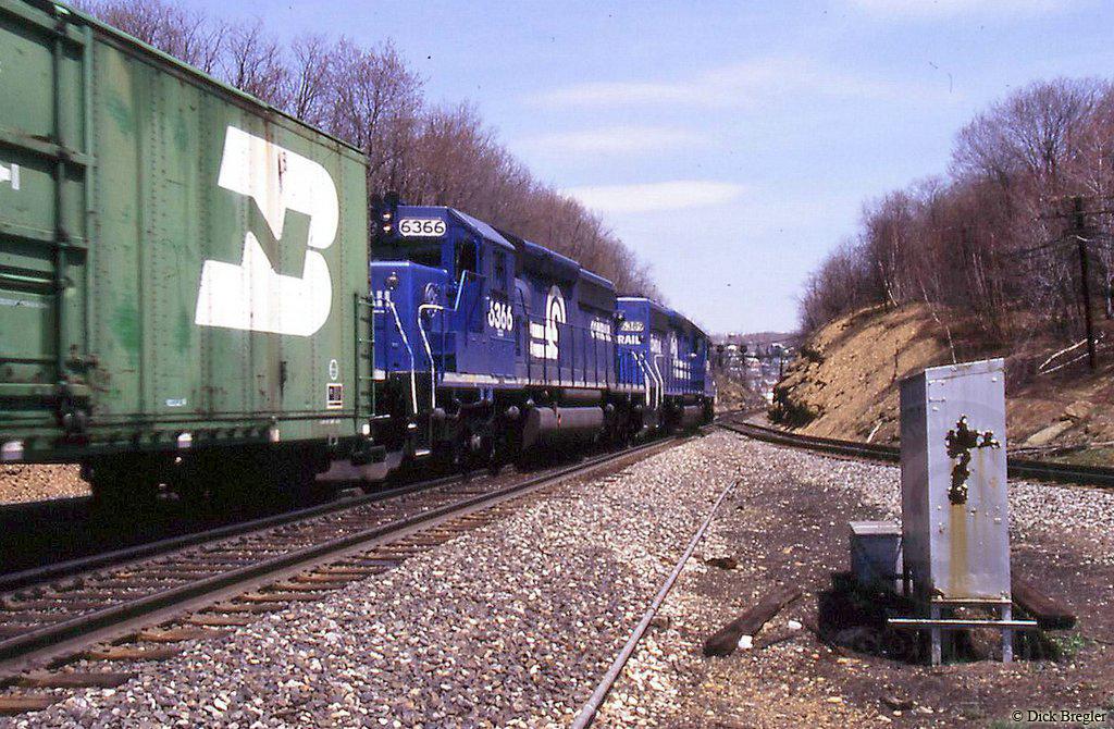 Conrail SD40-2 6366 is seen shoving on the rear of a westbound freight at Gallitzin, PA in 1993.