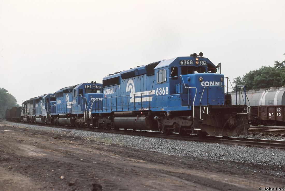 CR 6368 is seen with CR 6346, 3380, and another GP40-2 on a coal drag at Rutherford, PA on 8/11/1984.