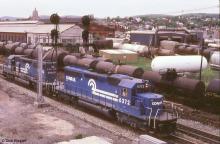 CR 6372 and CR 6394 are seen at CP-Works in Altoona, PA in 1981. In the background is the Union Tank Car facility that occupies the former PRR passenger car shops.