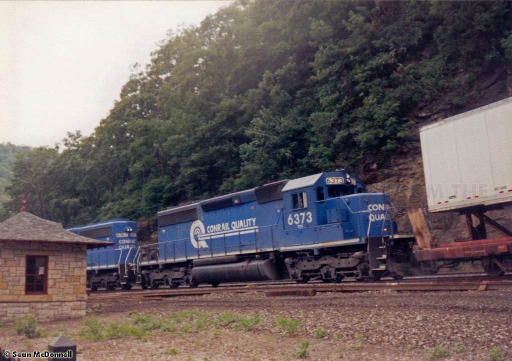 Conrail SD40-2 6373 is seen providing some extra braking on an eastbound TV train at Horseshoe Curve on 8/6/1995