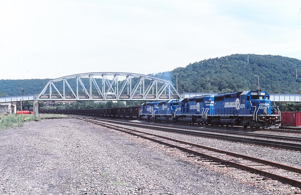 A quartet of CR SD40-2's that include, CR 6375, 6380, 6367 & 6373, are seen shoving a EB loaded train at Conemaugh, PA on 8/20/98.