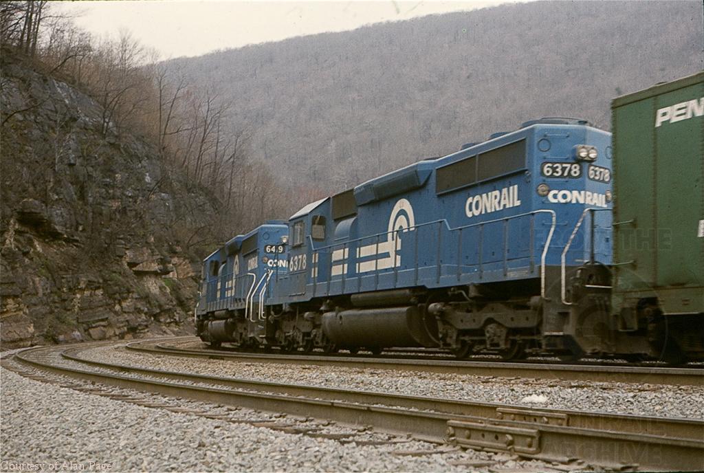 CR SD40-2's 6378 and 6419 brake round the Curve as they head to Altoona in March, 1978.