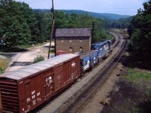 Just when the neighbors think it should be getting quieter, pusher 6386 howls by at the rear of BOEL. Ex ERIE van 21150 is the "class" N7E.