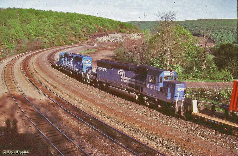 Conrail SD40-2 6411 is seen trailing on an eastbound TV train at Bennington Curve in 1983.