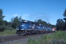 SD40-2 6424 storms over the crest of the grade at MP 142 in the center of Hinsdale, MA. with SV6 on the morning of Aug. 6, 1994.