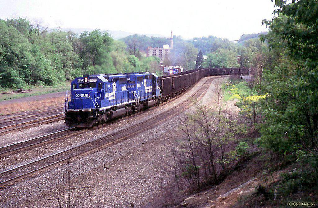 Conrail SD40-2 6432 is seen leading a westbound empty coal train at Tyrone, PA in 1992.
