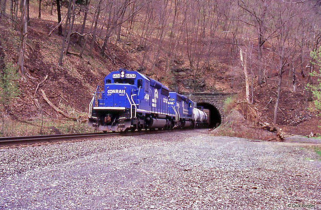 Conrail SD40-2 6434 is seen leading an eastbound freight out of the Spruce Creek tunnel in 1993.