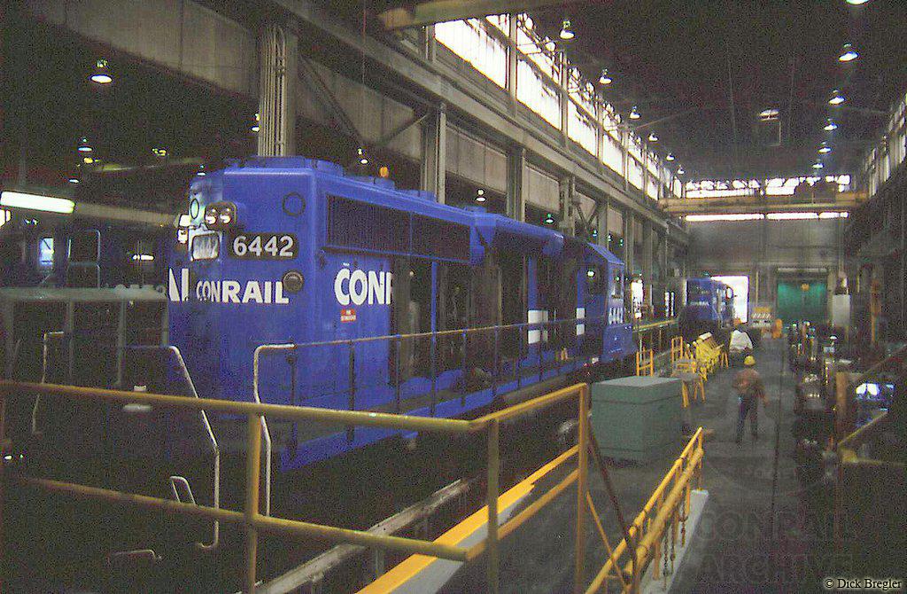 Conrail SD40-2 6442 is seen receiving some maintenance inside the Enola Diesel Shop during a 1986 PRR T&HS tour of the facility.
