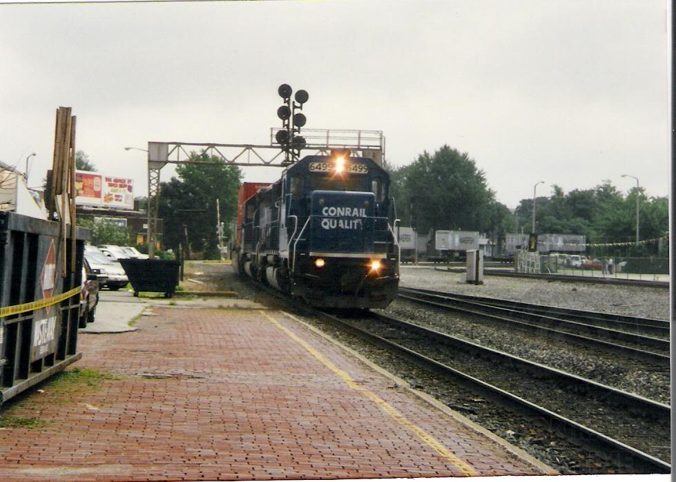 Conrail SD40-2 6499 leads train TV207 past the passenger depot in Elkhart, IN on August 2, 1996