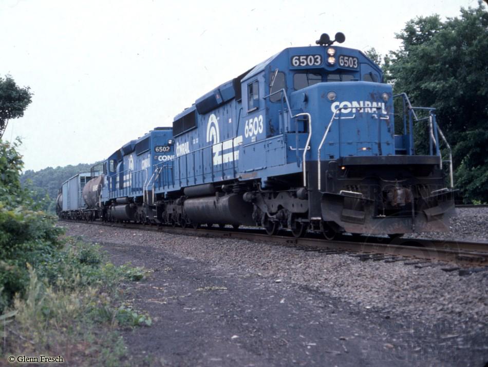 The Devault local, this day powered by SD40-2s 6503 and 6502, has opened the switch at Perkiomen Jct., just west of Valley Forge National Park, and begins to proceed down this ex Reading branch. This is the Summer of 1995, and traffic to the American Sweeteners Plant is booming, calling for this local to run almost every day.