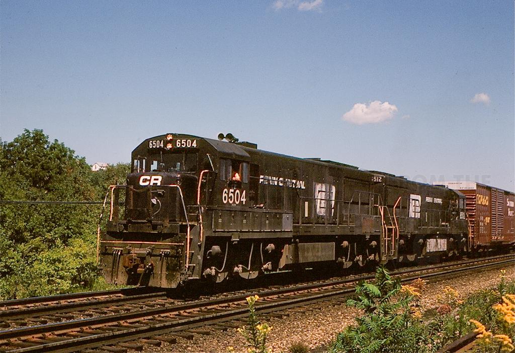 Former PC U25C's 6504 and 6512 roll by the Juniata shops deadline in August, 1977.