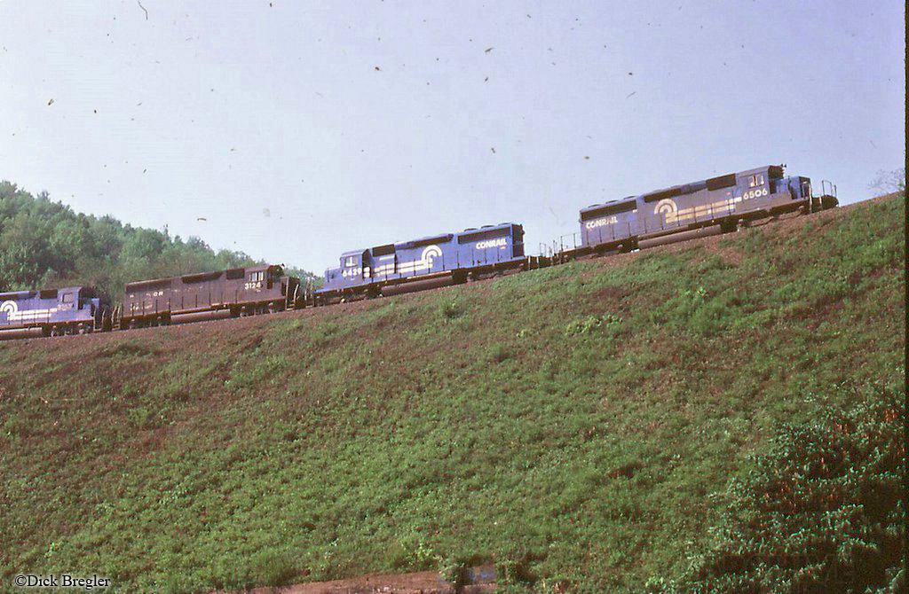 Conrail SD40-2s 6506 and 6429 are ahead of GP40 3124 (ex-PC 3124) are heading down around Horseshoe Curve in 1982.
