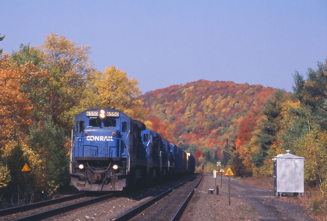 C30-7A 6550 with SENE passing the HBD/DED at MP 135 (Ballou's) in Washington, MA. on Oct. 9, 1997. This detector always identified it's location as "Becket, MA." even though it is in Washington. That is because the nearest "station" is North Becket/MP 134, just a mile to the east. Washington "station" is over 2 1/2 miles to the west.