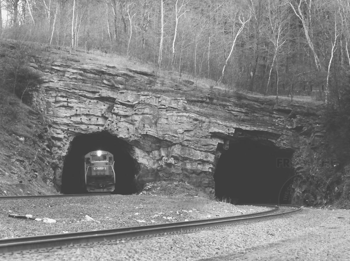 CR 6552 peeks out of the west portal of tunnel 1 in Canaan, NY. with MBSE on April 23, 1988.