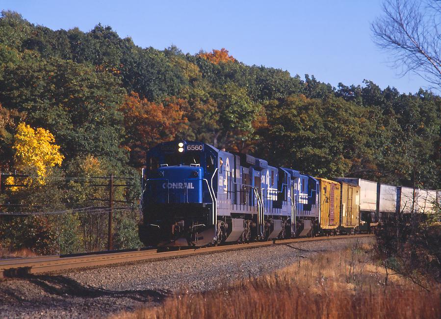 A PWSE-Y, led by the 6560, follows right along behind a PWSE near MP 60 in Spencer, MA. on Oct. 6, 1987.