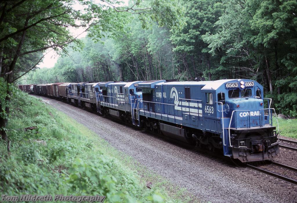 Conrail C30-7A 6563, 6579 and two other GE units working hard upgrade with an eastbound at Dalton, MA on the Boston Line on 10 June 1990.