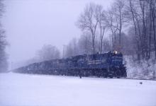 The 6567 and brethren lead a UMT (Mt. Tom-Holyoke, MA.) coal train through Chester, MA. at 08:41 on what would be a snowy Jan. 4, 1994.