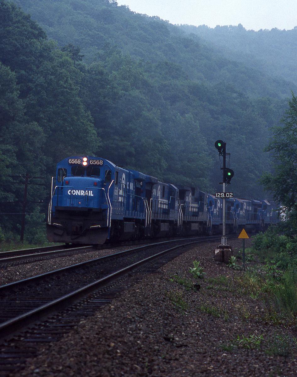 For a number of years, I had wanted to get up the the former B&A. Finally, I had the opportunity in 1987. I was not disappointed. The scenery in the Berkshires was beautiful and there was plenty of access to the east side of Washington Hill. Not a gate nor a "No Trespassing" sign to be seen. We camped along the railroad a couple nights without a problem. The fog was starting to lift, west of Chester, MA on June 13th, as westbound manifest MBSEX struggled upgrade, led by C30-7A No. 6568. Sadly, I didn't get back until 1994, and by then the area was gated and signs posted.