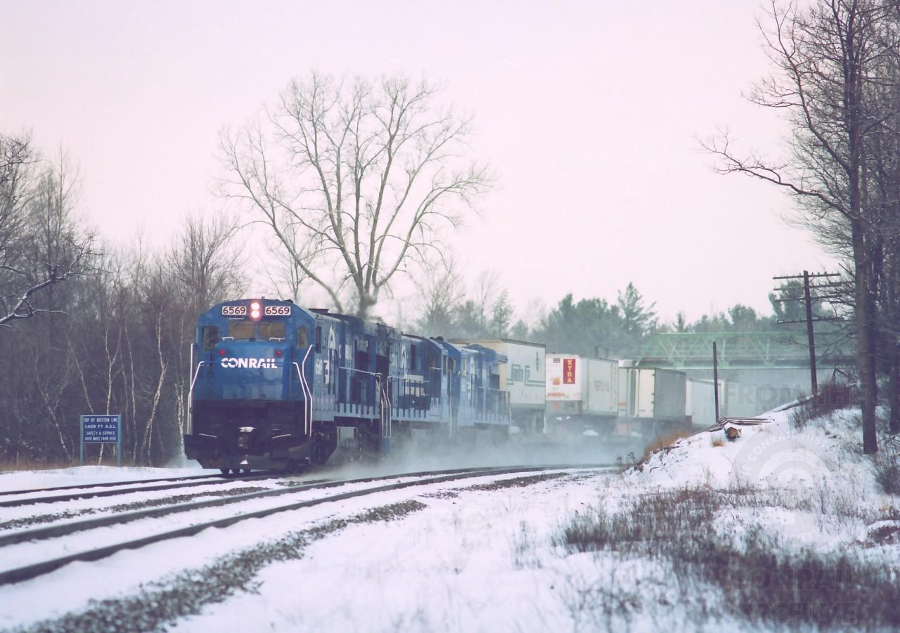 The 6569 leads TV6 beneath Bullard's Crossing bridge and over the summit in Hinsdale, MA. on Dec. 28, 1989.