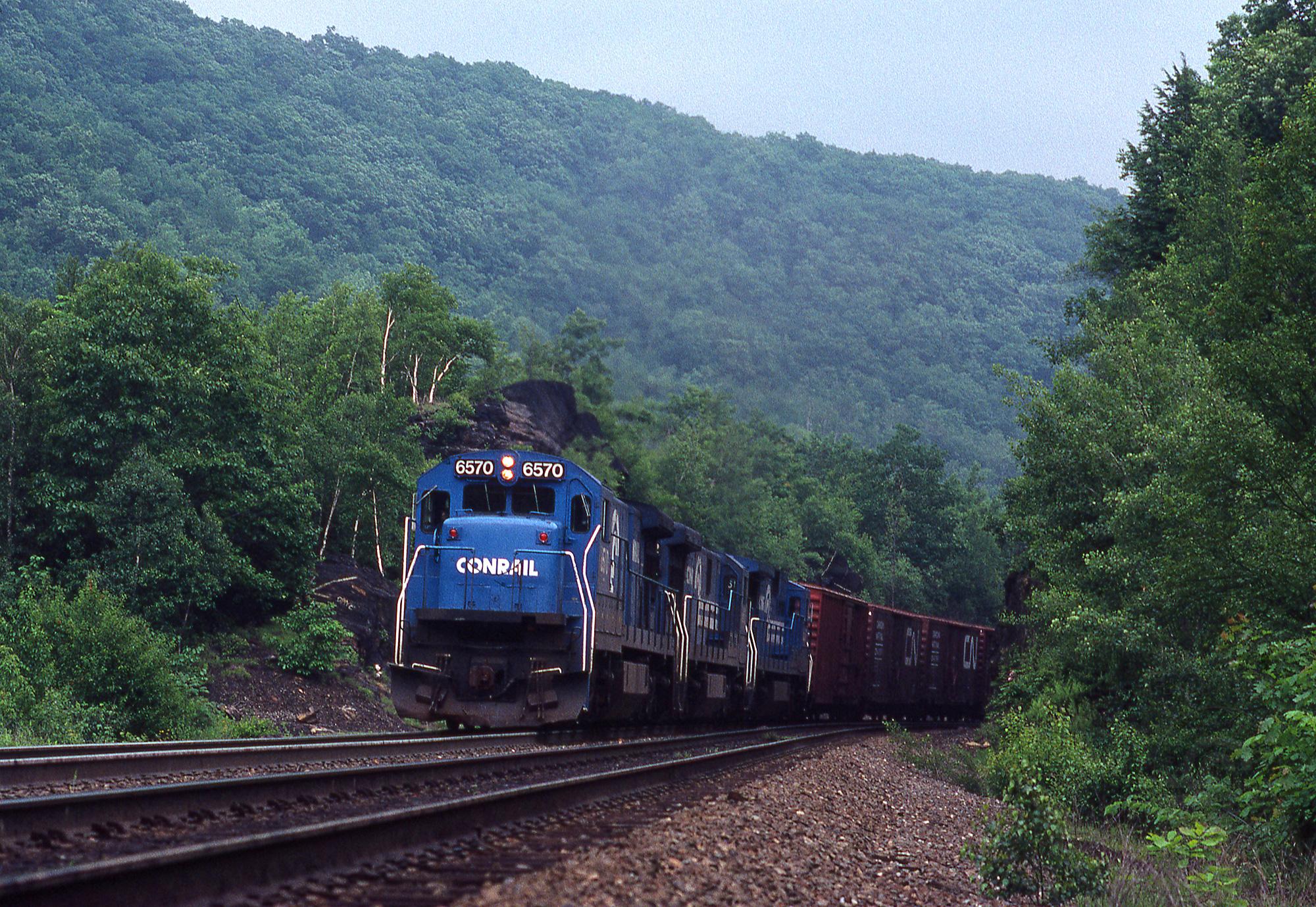 Westbound Conrail manifest MBSEY grinds upgrade near Bancroft, MA on June 13, 1987, led by C30-7A No. 6570. The C30-7As were one of the things that drew me to the B&A. In hindsight, the C32-8s were a bonus.