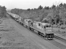 Conrail C30-7As 6572 and 6583 and a trailing GE product were in charge of TV-14 on 9 July 1989 at Hinsdale, MA on the Boston Line.