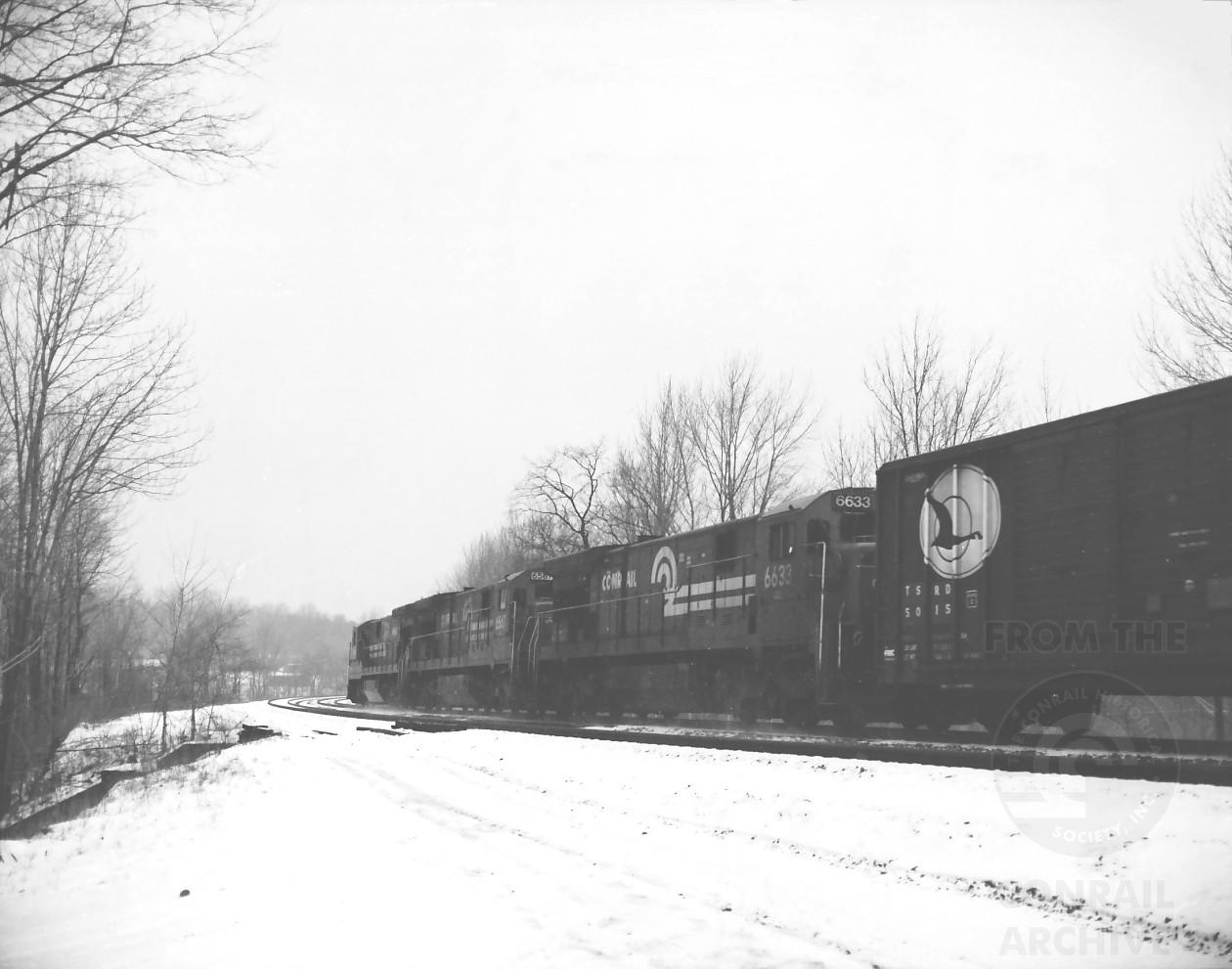 C36-7 6633 in UBO-21X as the headend crosses over Old Dalton Rd. in Hinsdale, MA. on Feb. 15, 1991.
