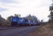 Westbound ballast train BAL786 near MP 141 in Hinsdale, MA. on Sept. 29, 1984. MASS State Rt. 8 overpass in the background.