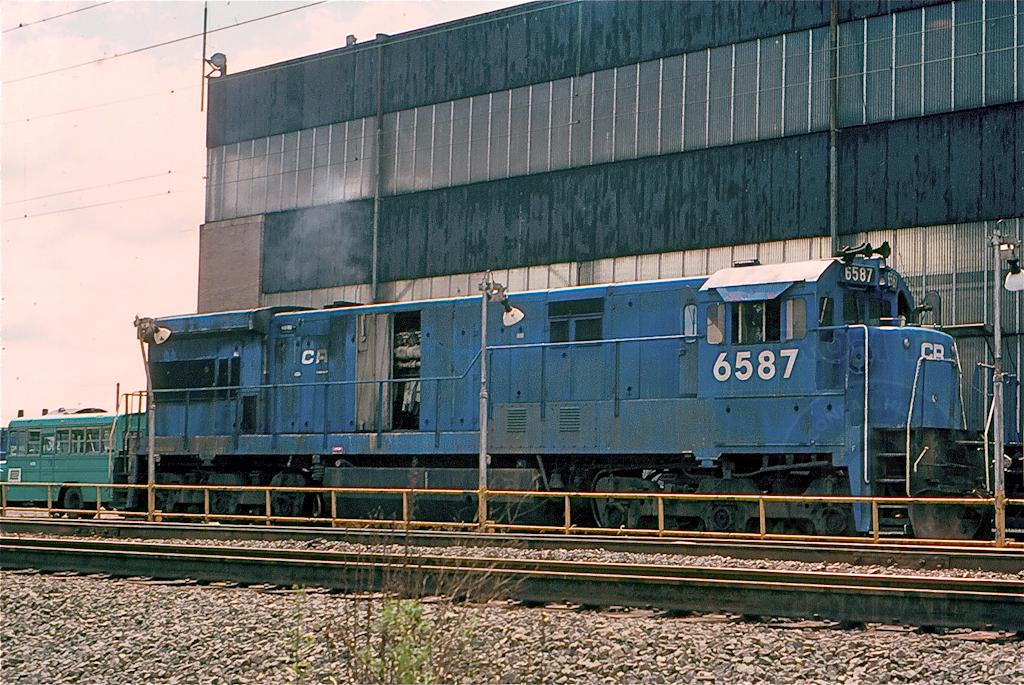 With a PC green bus behind, CR U36C 6587 (ex-EL 3316) has the power on at the service area outside the Morrisville shops in August, 1979.