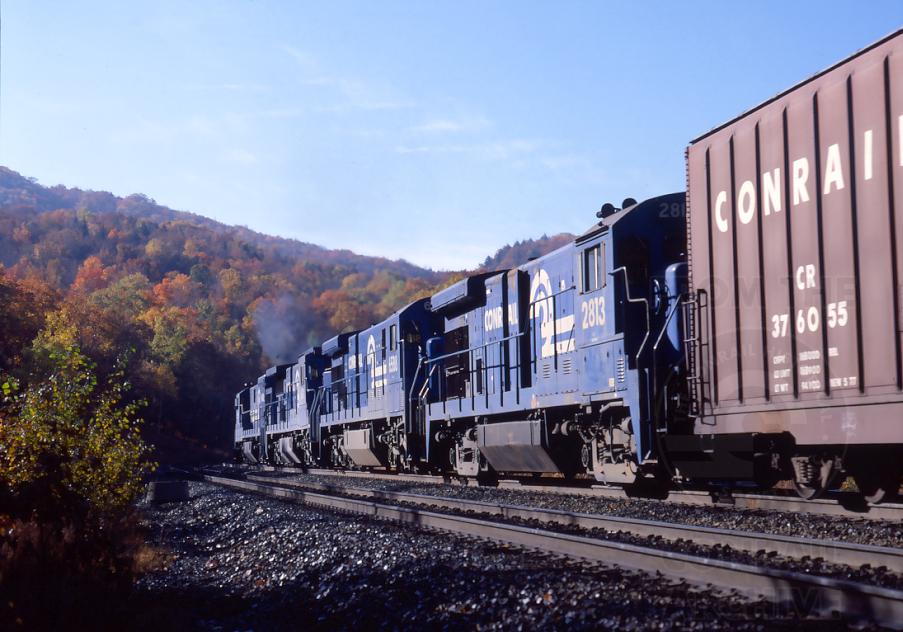 NHSE going away near MP 129 in Becket, MA. on Oct. 12, 1984. B23-7 2813 in the trail.