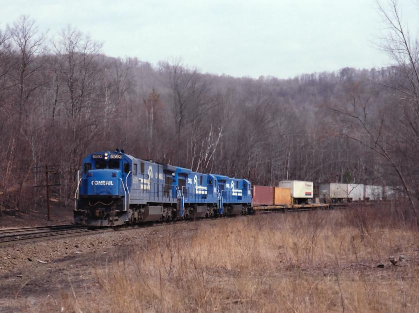 TV9, with the 6593 in charge, rounds the horseshoe at the east end of the "new location" in Middlefield, MA. on April 5, 1985.