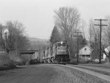 CR 6595 crests the grade with SEBO-B at MP 142 in the center of Hinsdale, MA. on Nov. 24, 1984.