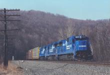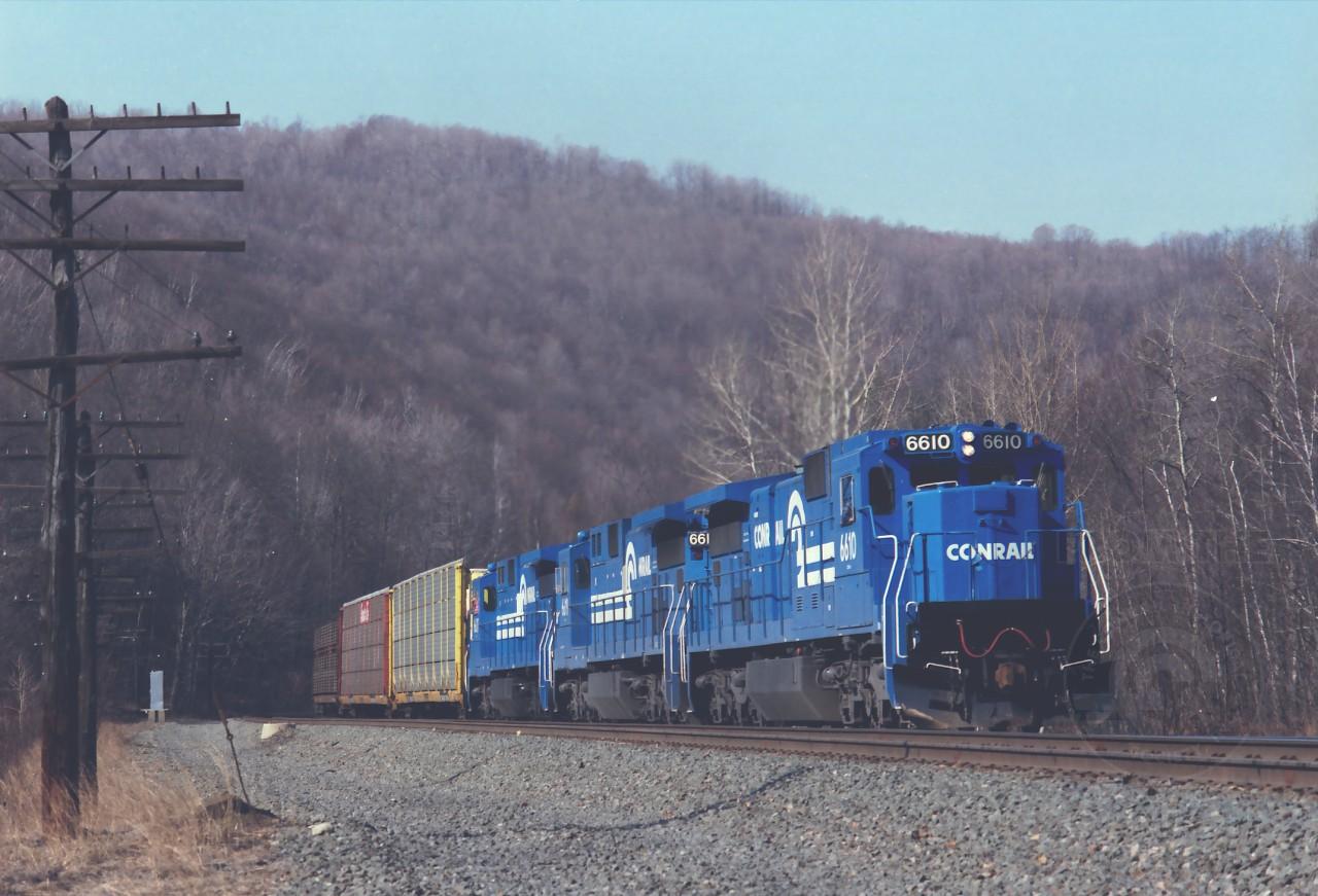 The 6610 leads a trio of C32-8's with BOEL near MP 129 in Becket, MA. on April 5, 1985. A rock slide and derailed engine in Washington cut resulted in BOEL and other westbounds running left-handed on track 2 for the day.