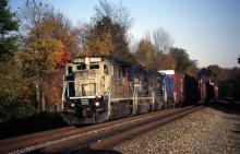 Rolling westward in her final autumn, a Conrail Ballast Express GE leads a pair of Espee motors and a leaser towards a UP connection at Proviso. Conrail never made it to October of the next year, and this trackage is now under the ownership of NS.