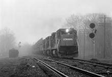 C32-8 6611 bores through the fog with SEFR at CP 57 in Charlton, MA. on April 17, 1987.