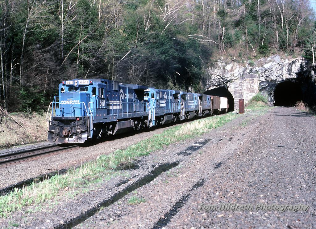 At 0830 hrs on 5 May 1991 C32-8 6611 and three other GE units brought SEMA east through State Line tunnel near Canaan Center, NY.