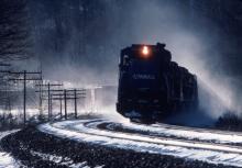 MBSE-9, with C32-8 6614 leading, threads the reverse curve between MP 122 and 123 in Chester, MA. on Dec. 30, 1987.