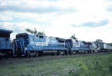 Three new B40-8's in TV14X at East Chatham, NY. on June 10, 1988. Dispatcher was heard on scanner requesting the lead unit to be isolated before tackling the west slope of Washington hill, to see how the 3 "new guys" could handle the train. Photos of the individual units can be found in the GE loco section.