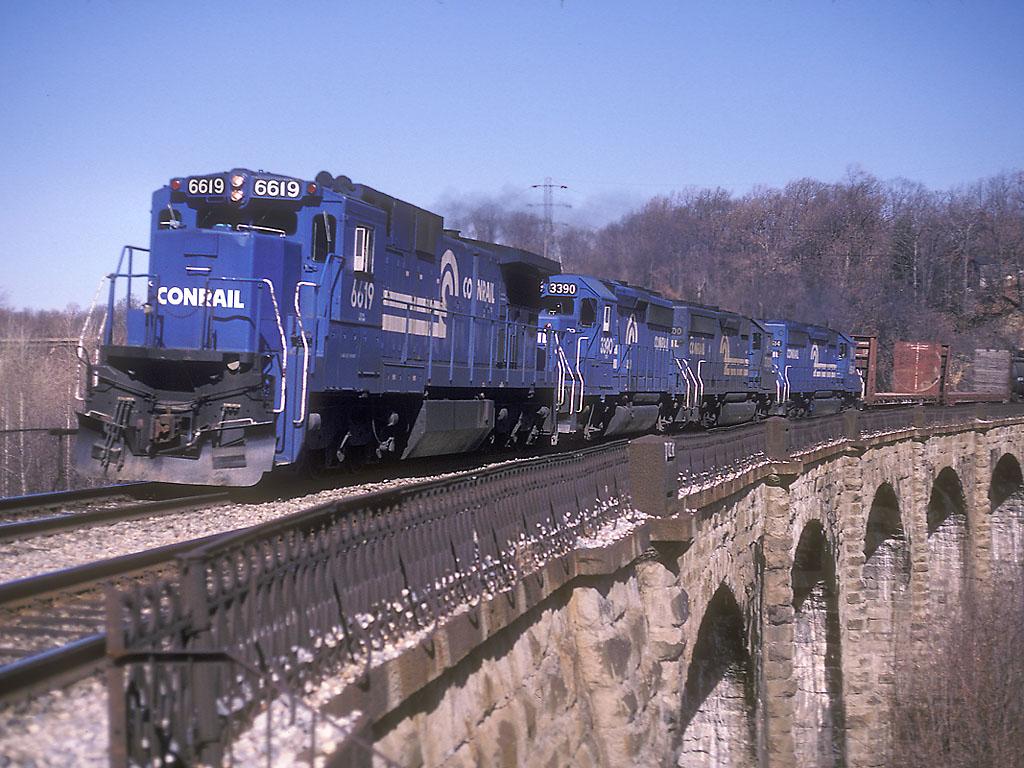 Here C32-8 6619 and three EMDs lead the southbound (westbound) SEPY on CSX's 1833 vintage Thomas Viaduct. This train is lacking the signature empty Tropicana Cars that usually feature heavily in photos of it.