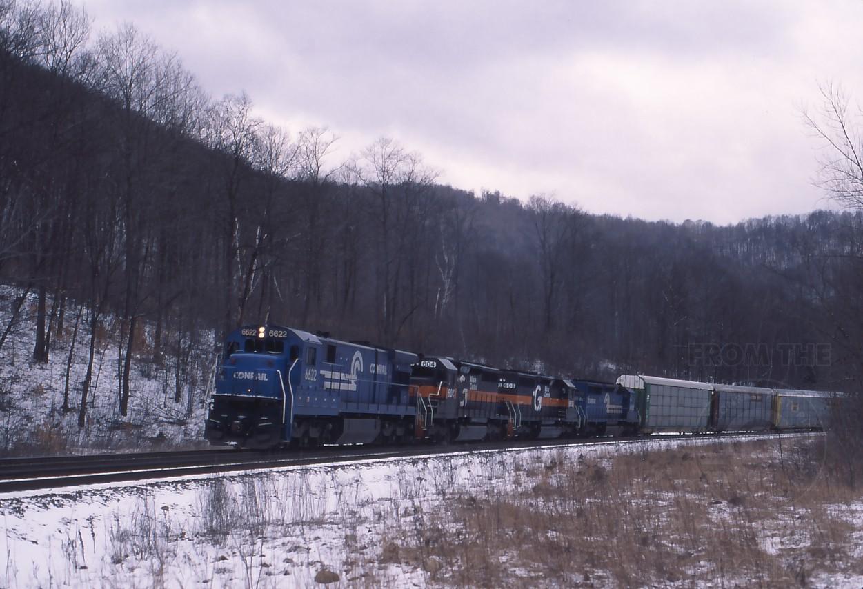 C36-7 6622 leads a air of GTI/MEC SD40's with BOSE around the horseshoe at mile 128.75 in Middlefield, MA. on March 19, 1992.
