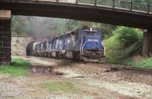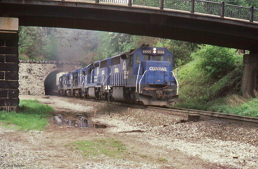 Conrail SD45-2 6666 is seen leading a westbound TV train out of the Allegheny Tunnel in Gallitzin, PA in 1986.