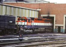 After a crew change, a GG-1 engineer pauses by ex-EL Bicentennial SDP-45 6669 (ex-EL 3638) outside the Enola shops on a dreary May 7, 1977.