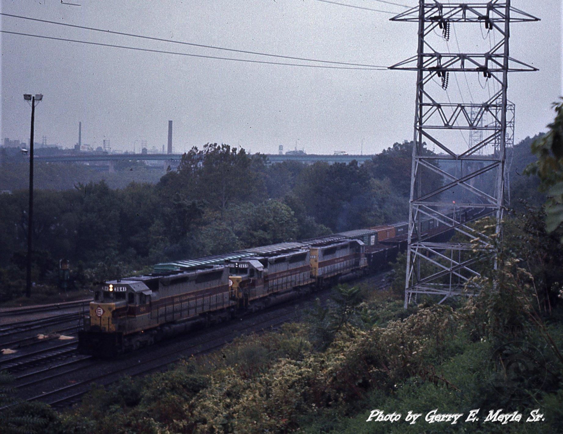 October 2, 1976. Early Conrail era. 3 matching EL SDP45s, 3641, 3659, 3645, bring a train through West Falls, Philadelphia. Future CR 6672, 6690, 6676