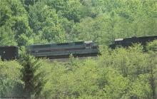 CR SDP45 6675 follows GP38-2 8068 down Horseshoe on May 22, 1977.