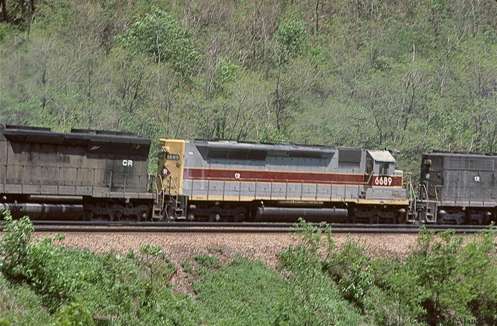 CR SD45 6157, SDP45 6689 (ex-EL 3658), and SD40 6277 hard at work dragging containers up Horseshoe on May 22, 1977.
