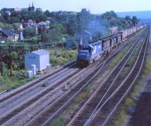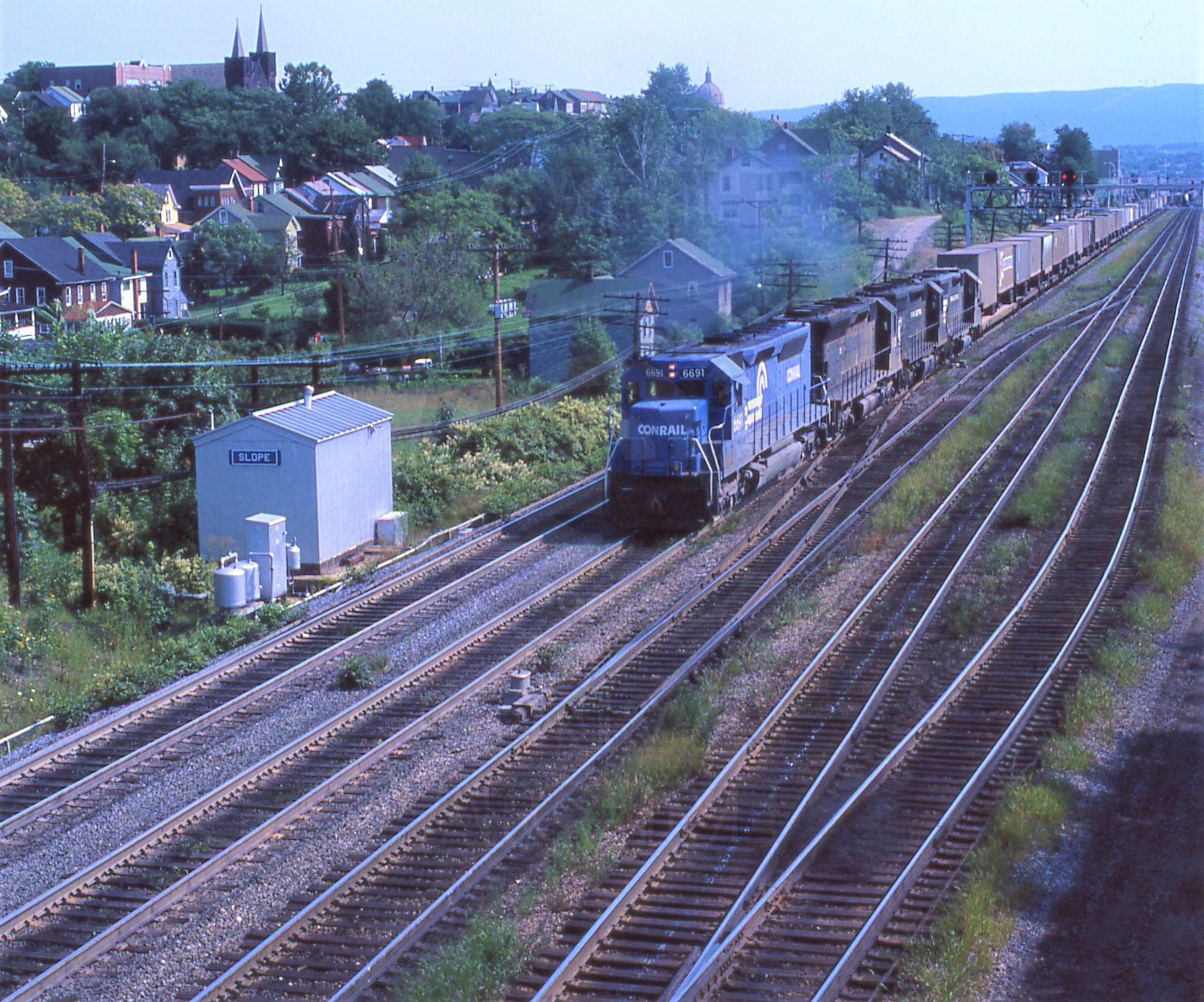 Conrail. SD-40 # 6691 & friends on trailer train at CP Slope, near Altoona, PA. Aug 17, 1977