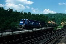 Conrail SDP45 6697 is seen crossing the Delaware River near Easton, PA in July, 1978