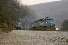 SD45-2 6698 heads down the Curve for more pusher duty as SD40 6256 leads a quartet of units up in March, 1978.