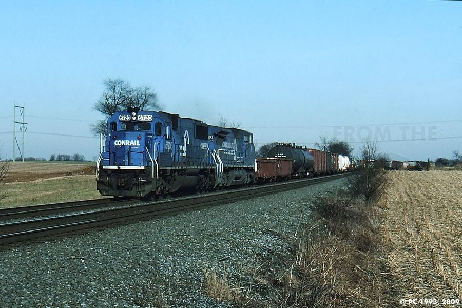 Conrail SD50 6720 brings ALCS west through Longswamp Township on the afternoon of January 26, 1993. The ALCS ran from Allentown to Rocky Mount, NC and became CSX R413 at Park Junction in Philadelphia.