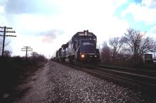 Previous Next CR 6727 and friends power Mail-8M just east of CP358 at Butler, IN on April 16, 1997 Photo By Chris Howe Year 1997 Original Date 4/16/97 Location City Butler IN Conrail Number 6727 Additional Galleries Chris Howe's Conrail action 1997 Collection CRHS Conrail Photo Archive Contributions